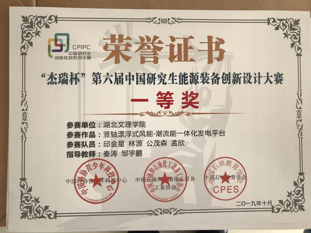 (机械学院 通讯员 秦涛)10月18日至20日,在中国石油大学(华东)举行的“杰瑞杯”第六届中国研究生能源装备创新设计大赛全国总决赛中,我校首届研究生邱金星同学表现优异,参赛作品《竖轴漂浮式风能-潮流能一体化发电平台》,经过演示、路演、答辩等环节的激烈角逐,喜获全国总决赛一等奖。伟德国际victor1946秦涛老师获评"优秀指导教师"。
