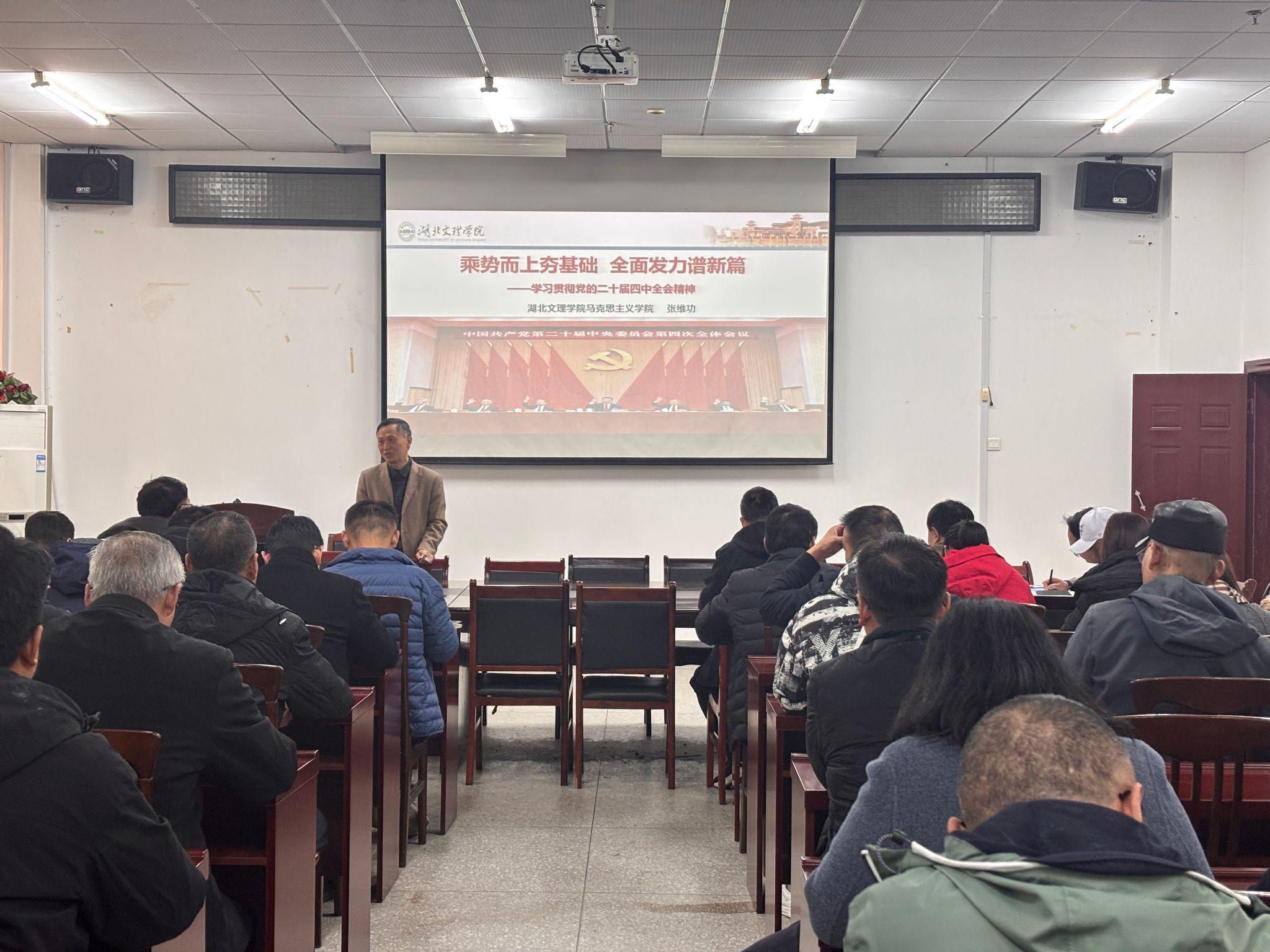 (通讯员 李凯)12 月 11 日,伟德国际victor1946组织开展教职工政治理论学习,特邀学校学习贯彻党的二十届四中全会精神宣讲团成员、马克思主义学院张维功副教授作专题宣讲报告,学院全体教职工到场聆听学习。