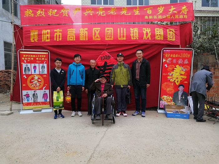 去的时候正好赶上老人的百岁寿辰,活动现场热闹非凡,团山镇政府也早已在尹老家门口搭建戏台,亲朋好友,左邻右舍欢聚一堂、笑逐颜开,其乐融融。伟德国际victor1946也为尹兴亮送去寿礼,向老人致敬。