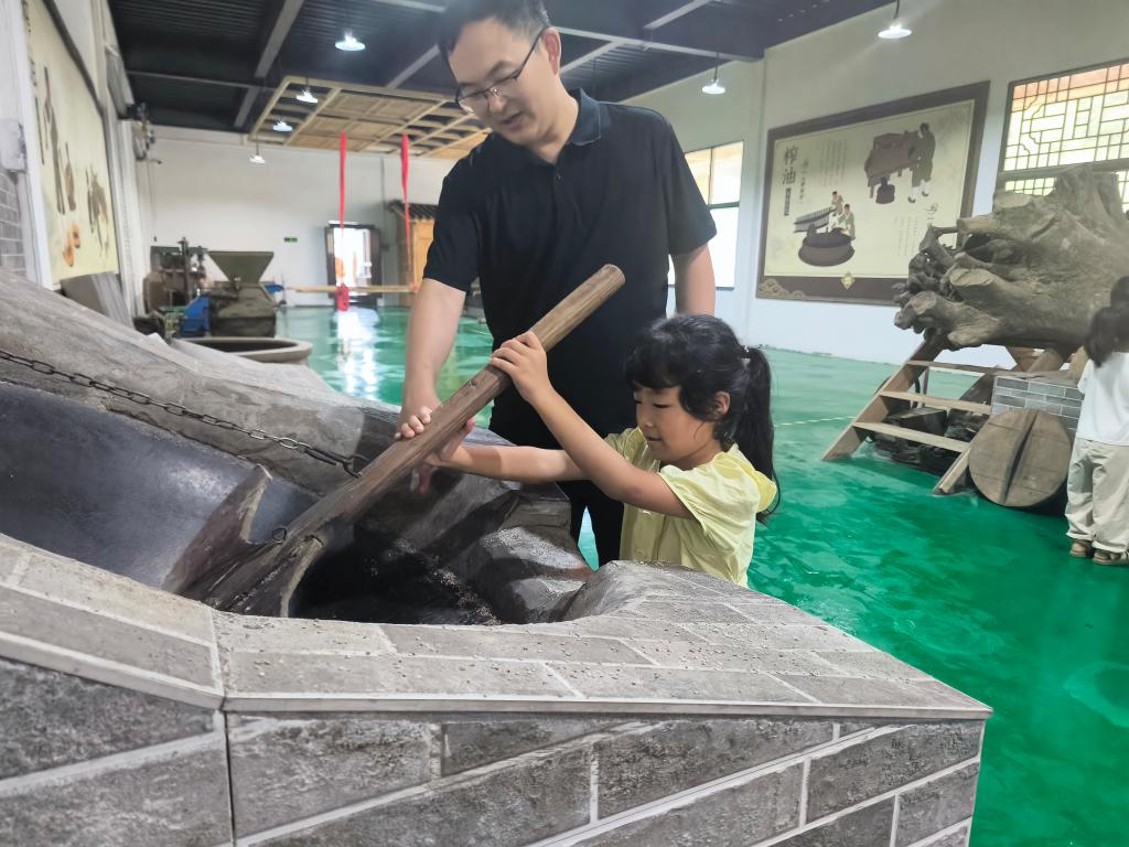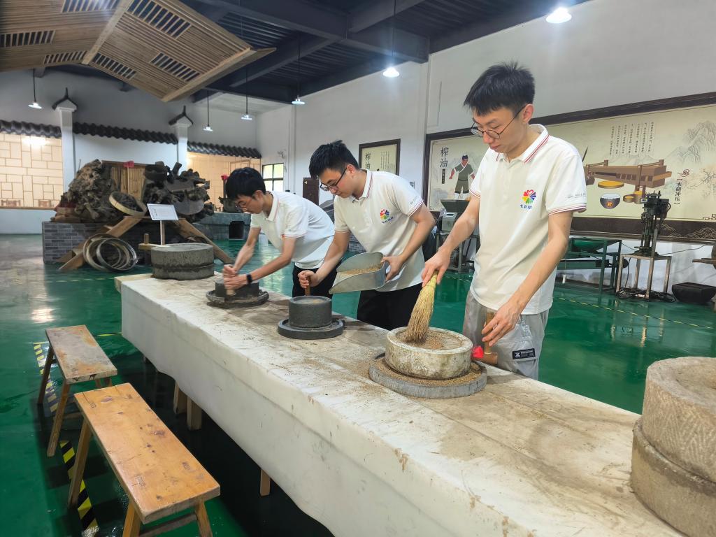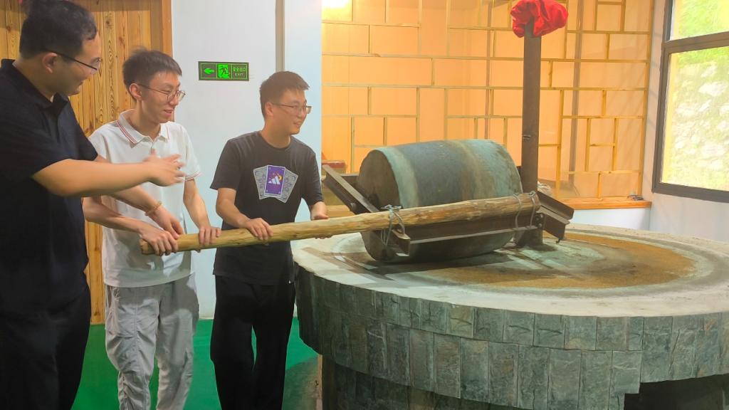 在传承人的指导下,志愿者们亲手操作那些承载着历史重量的古老工具——磨盘、碾盘,把精心挑选的菜籽放到大锅翻炒,煸出菜籽的香味,随后轮流推动沉重的石磨,将炒好的茶籽细细磨碎。随着磨盘的缓缓转动,茶籽逐渐被碾磨成细腻的粉末状,散发出阵阵茶香。从茶籽选料、炒籽、到碾磨的一系列过程,每一步都仿佛在诉说着千年的故事,让参与者感受到古法榨油技艺的复杂与精妙。