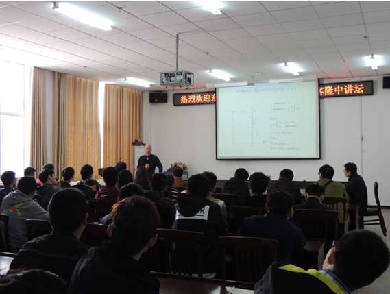 施建明教授首先以在考虑风险及收益的条件下,如何在夏天投资获取收益最大为背景,向听众介绍了线性规划模型。针对线性规划模型,施建明教授介绍了求解线性规划的LP-Newton方法。报告过程中,施建明教授与听众进行了友好互动。报告后,施建明教授还就申请去日本留学的途径以及在日留学的政策及相关要求向听众进行了详细介绍。