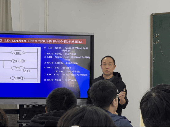 《机电传动控制》是学院今年入选的第三批国家一流本科课程,其课程设计始终以“理论深度与实践价值”为双导向。此次授课中,程老师以工业常用的三菱FX2N系列PLC为教学载体,搭建“基础指令学习—编程方法掌握—工程场景应用”的递进式教学路径。他以“逻辑取及线圈驱动指令”(LD、LDI、OUT)为切入点,结合多媒体课件动态演示,系统讲解触点串联/并联、边沿检测、脉冲输出等27条核心指令的功能原理。区别于传统理论授课模式,程老师将每条指令与梯形图设计同步结合,通过“指令书写规范解读—逻辑关系图表分析—程序调试现场演示”三步教学法,将抽象的编程逻辑转化为直观的控制流程,帮助学生快速理解指令应用场景。